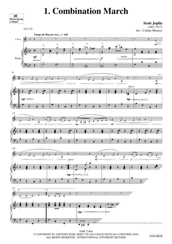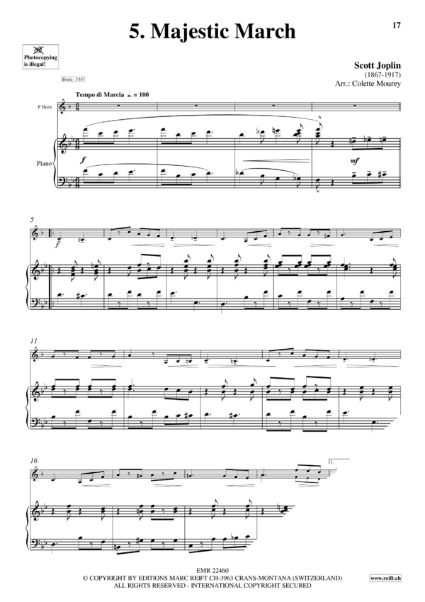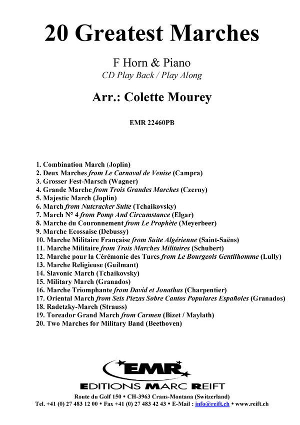 1. Combination March (Joplin) / 2. Deux Marches from Le Carnaval de Venise (Campra) / 3. Grosser Fest-Marsch (Wagner) / 4. Grande Marche from Trois Grandes Marches (Czerny) / 5. Majestic March (Joplin) / 6. March from Nutcracker Suite (Tchaikovsky) / 7. March No. 4 from Pomp And Circumstance (Elgar) / 8. Marche du Couronnement from Le Prophète (Meyerbeer) / 9. Marche Ecossaise (Debussy) / 10. Marche Militaire Française from Suite Algérienne (Saint-Saëns) / 11. Marche Militaire from Trois Marches Militaires (Schubert) / 12. Marche pour la Cérémonie des Turcs from Le Bourgeois Gentilhomme (Lully) / 13. Marche Religieuse (Guilmant) / 14. Slavonic March (Tchaikovsky) / 15. Military March (Granados) / 16. Marche Triomphante from David et Jonathas (Charpentier) / 17. Oriental March from Seis Piezas Sobre Cantos Populares Españoles (Granados) / 18. Radetzky-March (Strauss) / 19. Toreador Grand March from Carmen (Bizet / Maylath) / 20. Two Marches for Military Band (Beethoven)