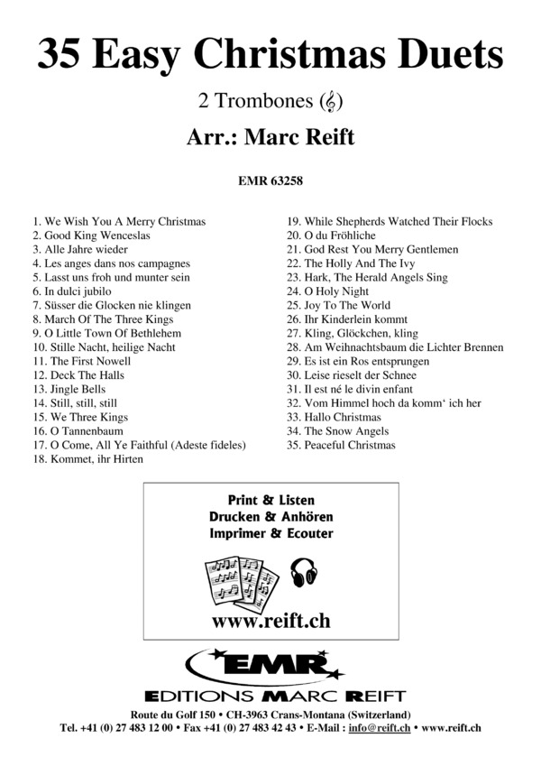 1. We Wish You A Merry Christmas 2. Good King Wenceslas 3. Alle Jahre wieder 4. Les anges dans nos campagnes 5. Lasst uns froh und munter sein 6. In dulci jubilo 7. Süsser die Glocken nie klingen 8. March Of The Three Kings 9. O Little Town Of Bethlehem 10. Stille Nacht, heilige Nacht 11. The First Nowell 12. Deck The Halls 13. Jingle Bells 14. Still, still, still 15. We Three Kings 16. O Tannenbaum 17. O Come, All Ye Faithful (Adeste fideles) 18. Kommet, ihr Hirten 19. While Shepherds Watched Their Flocks 20. O du Fröhliche 21. God Rest You Merry Gentlemen 22. The Holly And The Ivy 23. Hark, The Herald Angels Sing 24. O Holy Night 25. Joy To The World 26. Ihr Kinderlein kommt 27. Kling, Glöckchen, kling 28. Am Weihnachtsbaum die Lichter Brennen 29. Es ist ein Ros entsprungen 30. Leise rieselt der Schnee 31. Il est né le divin enfant 32. Vom Himmel hoch da komm' ich her 33. Hallo Christmas 34. The Snow Angels 35. Peaceful Christmas