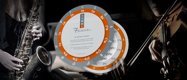 Hier geht's zum Erklärfilm Was haben Beethoven und AC/DC gemeinsam?Oder Adele und Mozart?Sie alle komponieren ihre Musik nach dem selben Prinzip.Passende Harmonien und Akkorde!Jedes Musikstück besteht aus Akkordfolgen, ausgehend von der jeweiligenGrundtonart.Hier kommt der 7-Zirkel in's Spiel.Durch den 7-Zirkel kannst du ganz leicht durch simples Drehen der Scheibeablesen, welche Akkorde zur jeweiligen Grundtonart harmonieren. Es stehenimmer die 7 verschiedenen und passenden Tonarten übereinander. Jetzt kannstdu danach ganz einfach improvisieren und eigene Musik komponieren. Dieorangen Tonarten harmonieren nur mit der jeweiligen Molltonart, z. B. Am mitE. Wenn ein Musikstück z. B. in C-Dur (Grundtonart) geschrieben ist, dannklingen Akkorde einfach gut und harmonisch, die zu C-Dur passen. Die 7 Tonarten können absolut frei miteinander kombiniert werden und passenimmer harmonisch zusammen.Die Vorzeichen der jeweiligen Tonart stehen im Quintenzirkel auf derRückseite des 7-Zirkel. Für wen ist der 7-Zirkel geeignet?Für alle die ...ein Instrument spielen oder erlernen wollenSongs schreiben möchten oder für sich selbst improvisieren den Quintenzirkel erlernen wollen (in der Schule, Musikschule, Musikstudium)