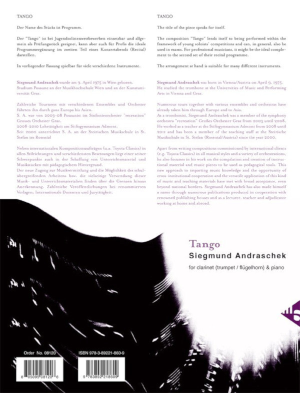 Der 'Tango' ist bei Jugendsolistenwettbewerben einsetzbar und allgemein als Prüfungsstück geeignet, kann aber auch für Profis die ideale Programmergänzung im zweiten Teil eines Konzertabends (Recital) darstellen. In vorliegender Fassung spielbar für viele verschiedene Instrumente.