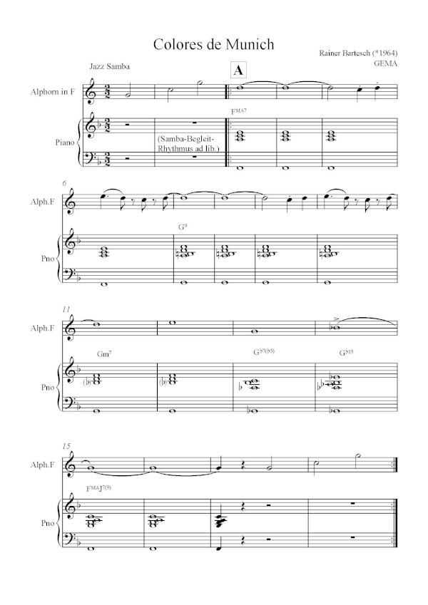 für Alphorn in F + Klavier + Samba-Begleitung ad lib.