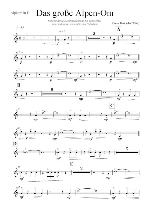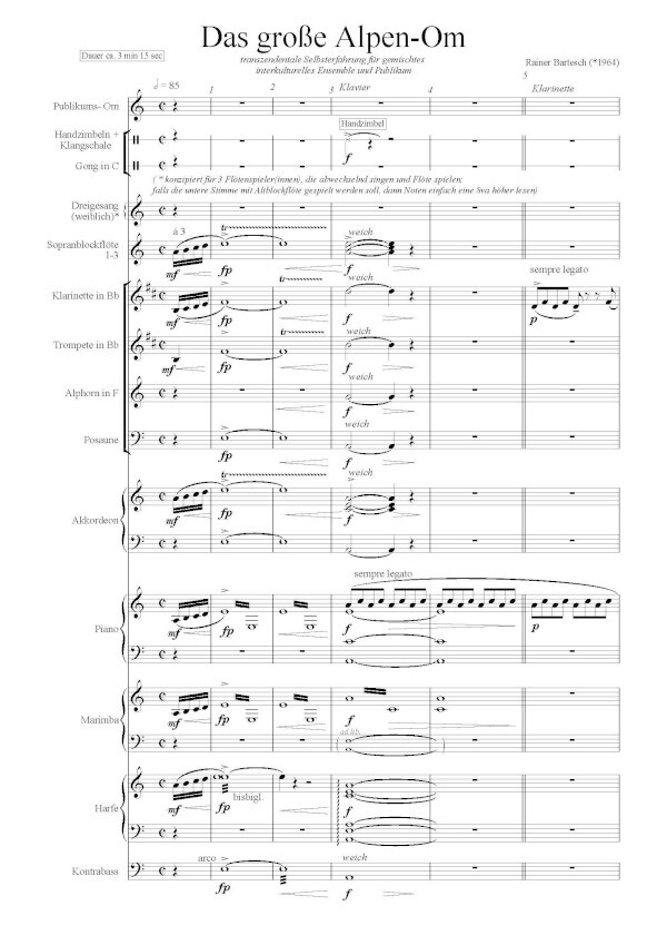 für Alphorn in F, Publikum, Gong in C, Handzimbeln, 3 Sopran-Blockflöten, Klarinette, Trompete, Posaune, Tuba (Kontrabaß), Gitarre, Marimba, Klavier + Akkordeon (ad lib.)