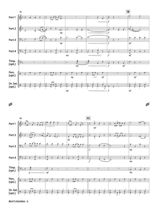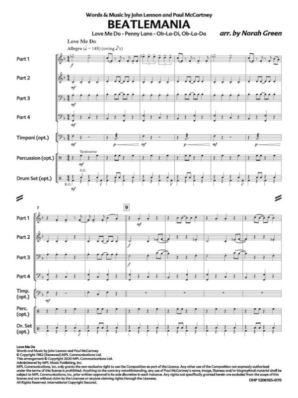 Der Begriff Beatlemania bezeichnete die extreme Begeisterung der Fans für die englische Rockband The Beatles in den 1960er-Jahren. Norah Green hat drei ihrer Hits aus dieser Zeit in einem Quartett-Arrangement zusammengestellt: Love Me Do, Penny Lane and Ob-La-Di, Ob-La-Da.