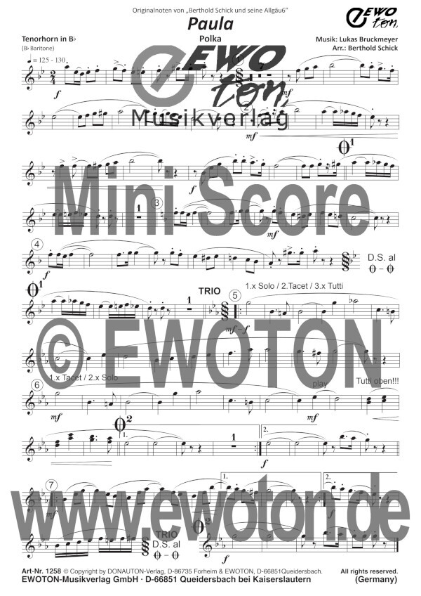 Die Besetzung besteht aus einem klassischen 6er Blech Register (1.+2. Flügelhorn Bb, Trompete Bb, Tenorhorn Bb, Bariton C/Bb und Bass C/Bb) und Schlagzeug und kann bei Bedarf um eine 1. und 2. Klarinette (ad lib.) erweitert werden - dafür steht unser PLUS! Somit sind Besetzungen mit bis zu 10 Musikern möglich. Zusätzlich enthält das Set auch eine 6-zeilige Partitur.