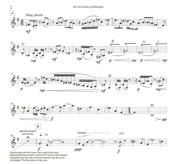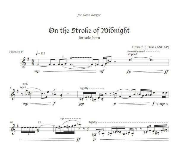 traverses a wide variety of atmospheres, from ranging from gentle, mysterious passages, to intense and powerful exclamations. Throughout there is a sense of mysticism, as if an incantation is taking place around the arrival of midnight. Various extended techniques enhance the traditional horn sound, such as stopped effects, simultaneous singing and playing, flutter tonguing, growling, etc. It may be performed as traditional concert piece, a theatre piece or as an hour-specific piece actually performed at midnight for the fun of it by oneself, or with a group of people. Score included. (4:53)