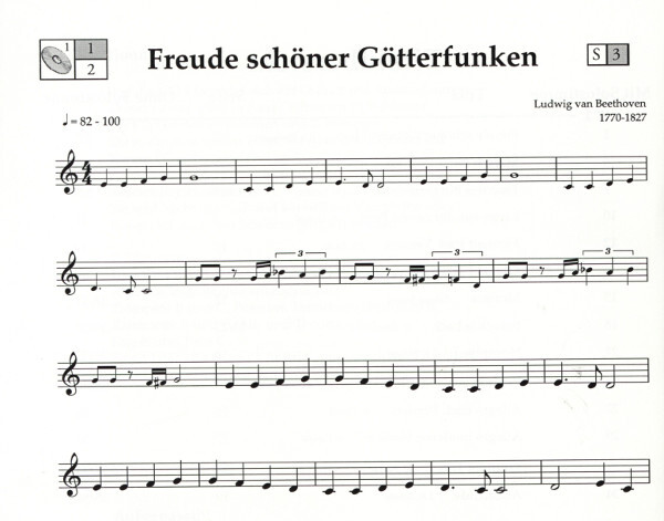 Bereits nach sechs Monaten Unterricht kann mit den ersten Stücken begonnen werden. Schon im 5- Tonraum kann der Schüler das Thema von Beethovens 9. Sinfonie, begleitet von einem Sinfonieorchester und Rhythmusgruppe, üben und vortragen, alles in 2 Tempi.Viele Lieder bewegen sich innerhalb der eingestrichenen Oktave.