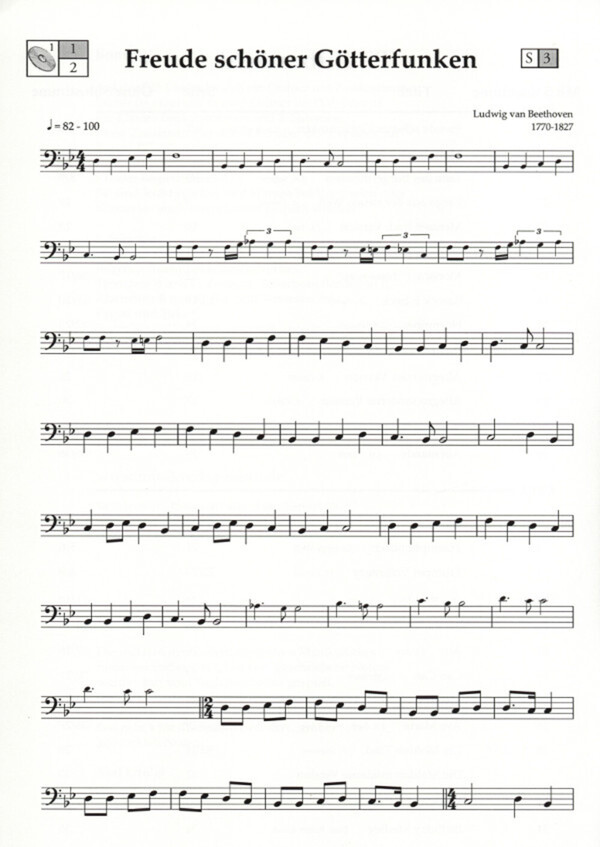 Bereits nach sechs Monaten Unterricht kann mit den ersten Stücken begonnen werden. Schon im 5- Tonraum kann der Schüler das Thema von Beethovens 9. Sinfonie, begleitet von einem Sinfonieorchester und Rhythmusgruppe, üben und vortragen alles in 2 Tempi.Viele Lieder bewegen sich innerhalb der eingestrichenen Oktave.