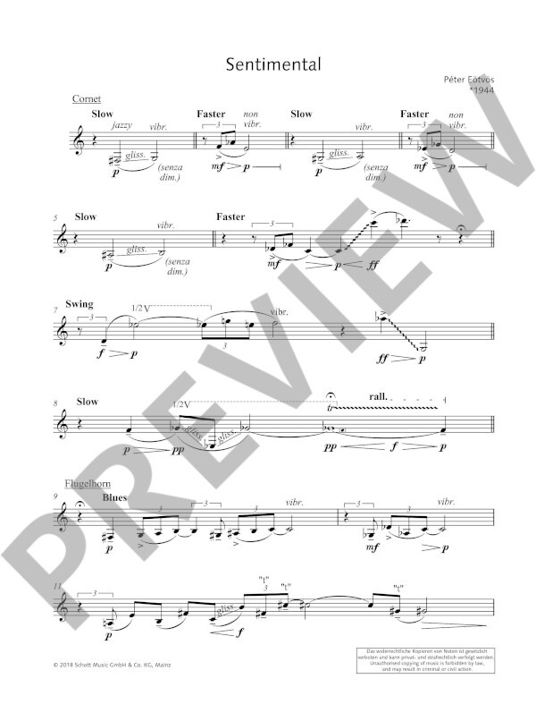 "Die Idee, zwei Instrumente abwechselnd zu spielen, stammt von Clark Terry, den ich in einem Video gesehen habe. Für mich war neben seiner Virtuosität in der Abwechslung beider Instrumente auch der Unterschied der Klangfarben eine wichtige, neue Information, als ob ein Geiger auf Violoncello wechseln würde. Das kleine Kornett in Es hat eine weiche, samtige Klangfarbe und es passt besser zum Flügelhorn als die bekannte Trompete, die etwas schärfer klingt. "Sentimentale" Musik braucht weiche Klänge. Diese Komposition ist meine Huldigung an Miles Davis und Chet Baker, zwei Idole meiner Jugendjahre." Peter Eötvös, 2017