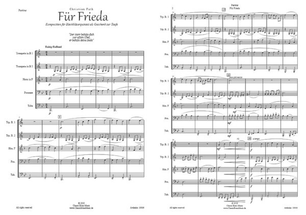Die Komposition "Für Frieda" ist ein kurzes Werk für Blechbläserquintett, welche in ruhig fließenden Rhythmen eine schlichte und gleichsam beruhigende Melodie umspielt. "Für Frieda" wurde in Tröbnitz bei Stadtroda uraufgeführt und fand im dortigen Kreise großen Anklang. Spielen Sie "Für Frieda" in ihrem Konzert und lassen Sie Ihr Publikum einen wunderbaren Klangeindruck mit nach Hause nehmen.