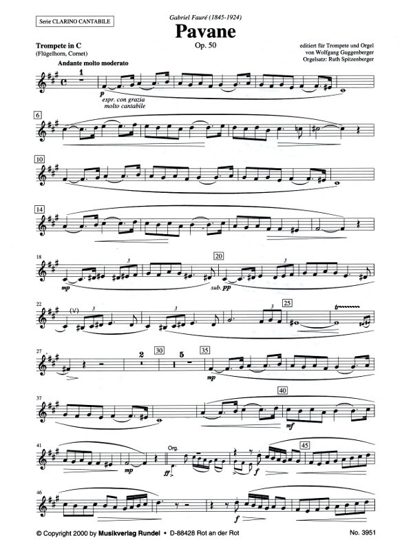 Seine Pavane (op. 50) schrieb Gabriel Fauré im Jahre 1887 für Orchester mit Chor ad libitum. Der den Chorstimmen unterlegte Text handelt vom Leiden in der Liebe. Fauré erzählt diese Geschichte mit der intensiven Expressivität einer schlichten Melodie und Harmonik. Die vorliegende Bearbeitung betont die reiche Klangfarbenpalette der beiden Instrumente und zeichnet die zart melancholische Atmosphäre nach