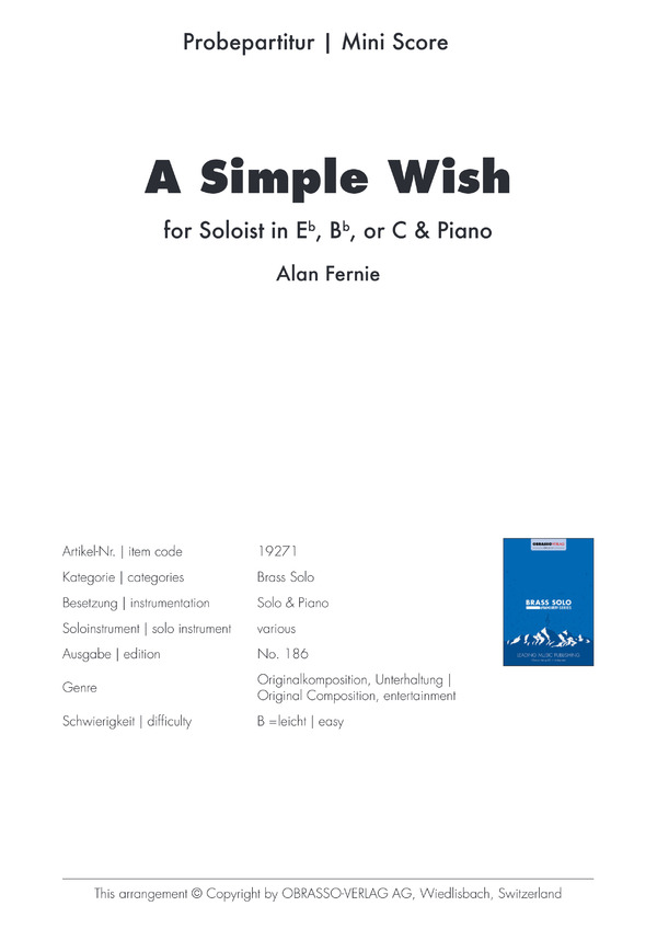 B Cornet (Trompete), Flügelhorn, Bariton, Posaune oder Euphonium (Solo), C-Trompete oder Tenorposaune (Euphonium) in C Bass-Schlüssel (Solo), Es-Cornet oder Es-Althorn (Solo)