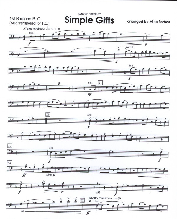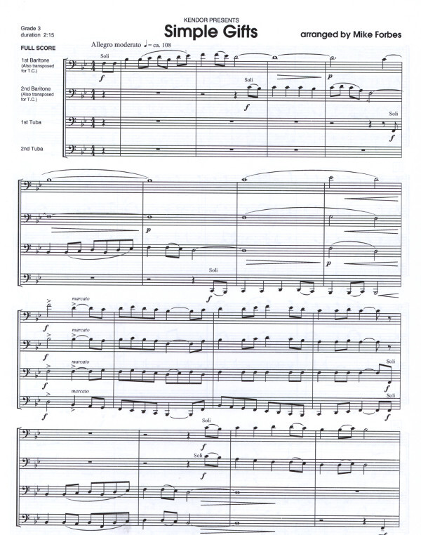 Popularized by Aaron Copland in his 1944 score for Appalachian Spring, this 19th-century Shaker dance tune lends itself beautifully to the rich sound of a baritone-tuba quartet. This fun-loving, theme-and-variations treatment gives each member of the group interesting material to play. Duration 2:15.