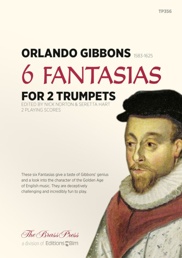 Orlando Gibbons (1583-1625) Duette für Instrumente im Violinschlüssel, hier für Trompeten verlegt (B oder C oder Flügelhorn), sind von ausserordentlichem musikalischen Wert. Diese 6 Fantasias enthüllen Gibbons musikalisches Genie und vermitteln Einbllick in das goldene Zeitalter der englischen Musik.