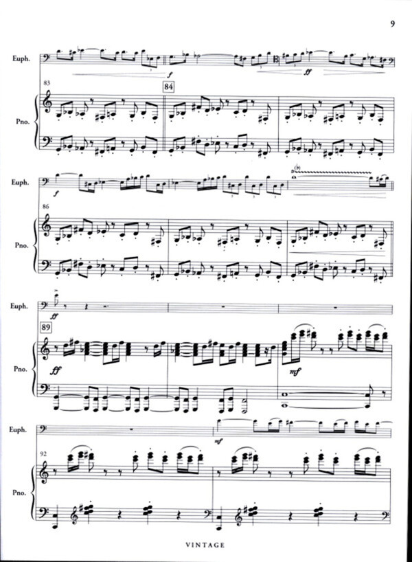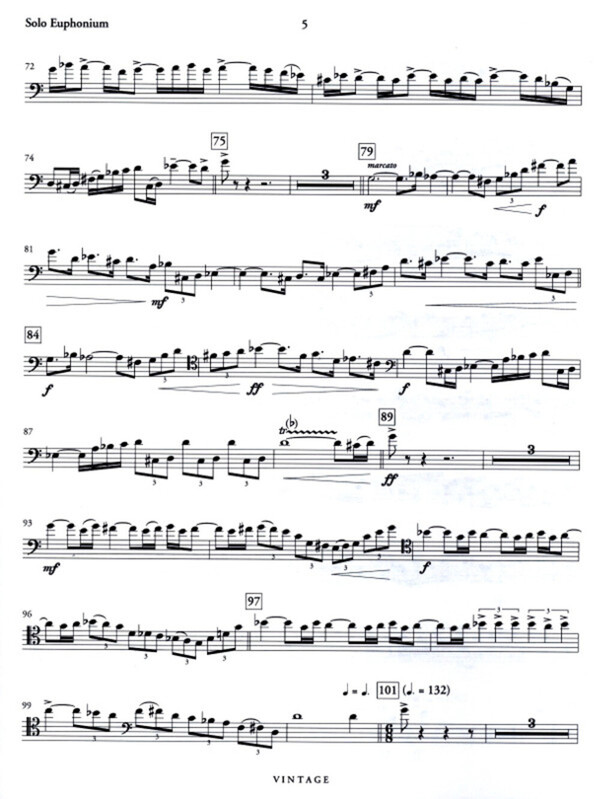 A standard solo and a mainstay for many competitions, Vintage combines Gillingham's intimate knowledge of how to write effectively for the instrument. This composition features wonderful soaring lines in the euphonium (ascending up to high C's) while at the same time mixing in a jaunty and highly rhythmic 5/4 section. All the technical aspects of the piece, while challenging, are well thought out and effective for performer and audience. This full wind band version of this features some lush instrumental textures and makes it a common choice for programming.