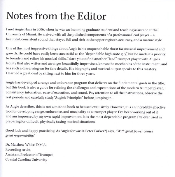 Build Your Range is a practical approach to building range and endurance to suit the current demands of all trumpet players. These ten studies are designed to help build range and endurance, as well develop time and pitch with the accompanying play-along (included with purchase). This book will help you gain a strong upper-register and ability to hit high notes, one of the most sought out tasks by trumpet players. As an added bonus, Augie Haas warm-up is also included.