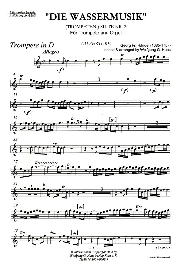 Wassermusik Nr.2 "Trompeten Suite" D-Dur Partitur, Stimmen, Ausg. für Trompete in D (C, A), Orgel (Piano)