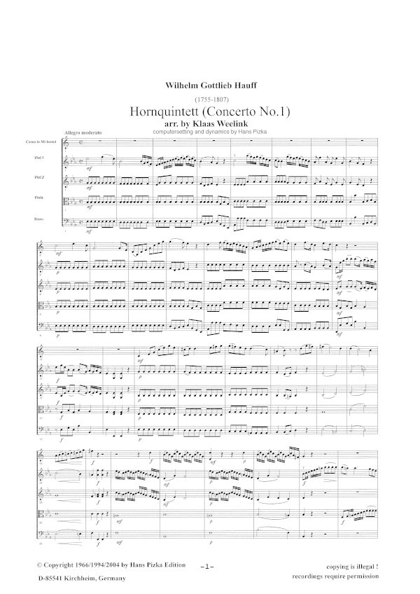 für Horn in Es, 2 Violinen, Viola, Celo / Bass