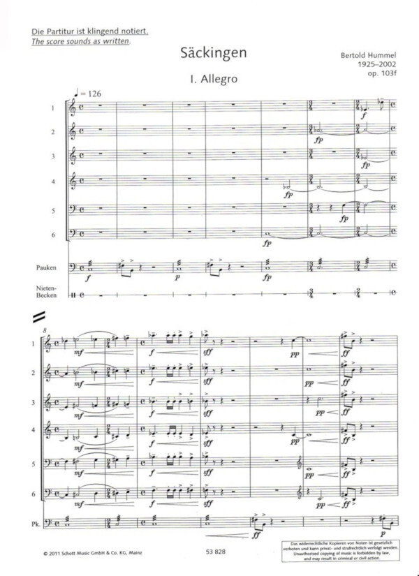 Der Titel des Stückes bezieht sich auf den Uraufführungsort Bad Säckingen. Dort versammelten sich im November 2000 die Mitglieder der Europäischen Trompetergilde (European Trumpet Guild). Bertold Hummel wurde gebeten, ein Stück für diesen Anlass zu komponieren. Der Komponist verwendet darin sechs Trompeten von der Basstrompete bis zur Piccolotrompete, ergänzt nur von den Pauken. Die drei Sätze sind kontrastreich; im zweiten Satz wird der Hörer mit einem "Nachhall" von Luthers "Ein feste Burg ist unser Gott" überrascht. Im letzten Satz taucht eine bekannte, moderne Melodie auf, wird verarbeitet und mündet rasch in ein dramatisches Finale.