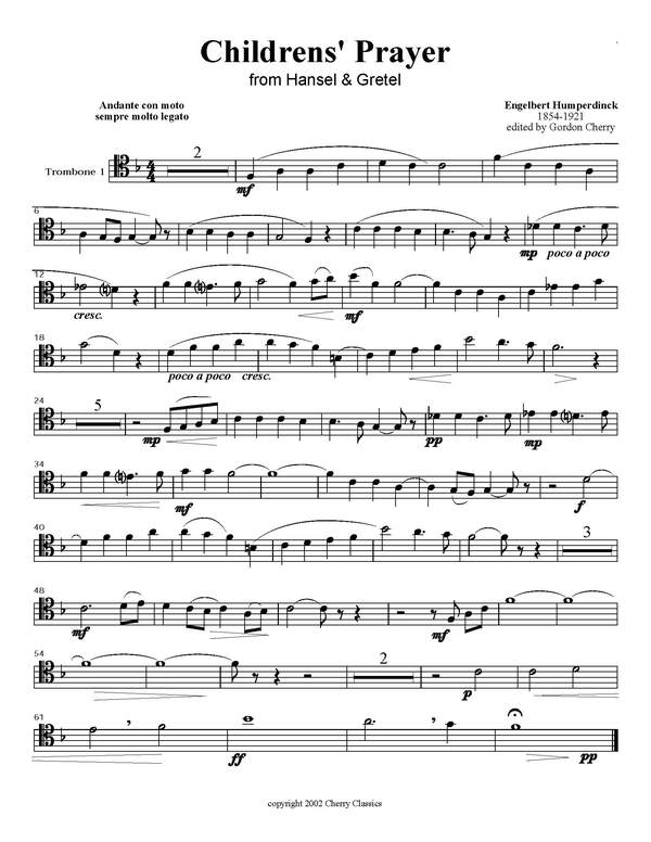 Transcribed by retired Principal Trombonist of the Vancouver Symphony, Gordon Cherry. This work is for 8 trombones, and is taken from the famous scene in the opera when the children say a prayer before going to sleep in the deep forest. This work has a very beautiful sound and shows off the legato and expressive qualities of the trombone choir.This transcription is very tastefully done, with minimal editing of dynamics and phrasing.
