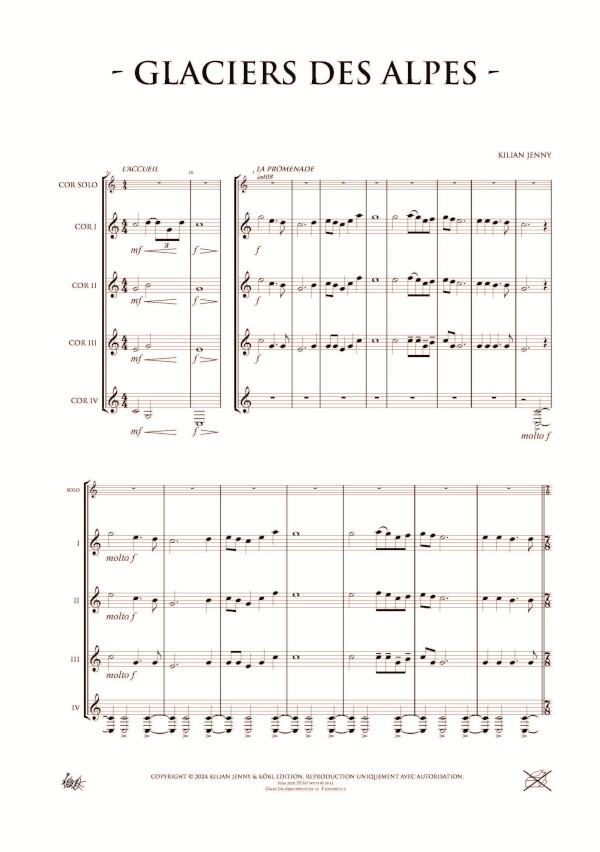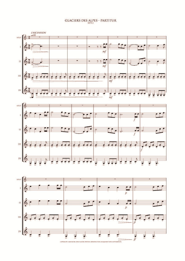 Ein fantastischer Wandertag bis zum Gipfel erwartet uns! Voller Vorfreude wandern wir durch die ersten kühlen Lichtungen des Waldes und erreichen bald den Fuß eines kleinen Anstiegs, der uns im 7/8-Takt bis zum Gletscher führt. Dort wird es gefährlich, und während wir Gletscherspalten und Abgründe überwinden, kommen wir unserem Ziel und der atemberaubenden Aussicht immer näher. Mit voller Begeisterung genießen wir unser Abenteuer. Eine ultra kompakte Mini-Alpensinfonie für wahre Jagdhorn Enthusiast/Innen, aber auch bequem auf dem Waldhorn spielbar.