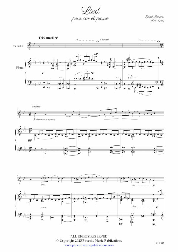 Lied by Joseph Jongen is a short, lyrical work lasting approximately four minutes. Composed by the esteemed Belgian composer Joseph Jongenactive during the late 19th and early 20th centuriesthis piece exemplifies the lush harmonic language of the Romantic era, delicately touched with impressionistic color. Intimate and expressive, Lied serves beautifully as a recital piece or a brief interlude in a larger concert program.This edition is part of our new "Historical Treasures" seriesa curated collection dedicated to rediscovering and revitalizing significant works from the past. The series features compositions ranging from the obscure to the well-known, many of which are difficult to obtain in quality editions. Our mission is to make these gems more accessible by offering carefully prepared scores, free of misprints and editorial errors that often plague older publications. Where possible, we also provide editorial improvements to enhance readability and performance practicality, ensuring these works can be enjoyed by musicians and audiences alike.