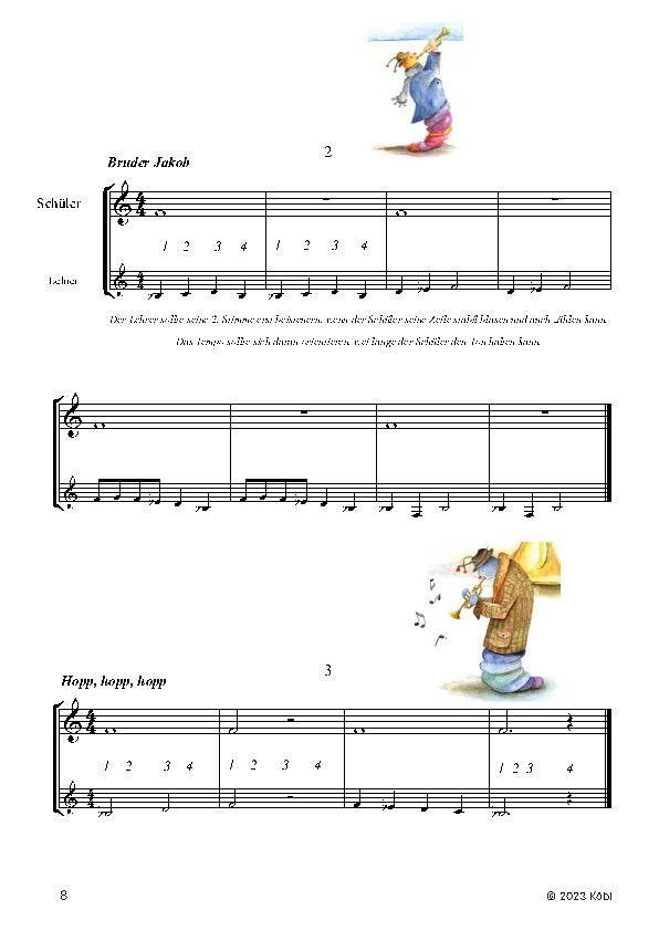 Auch kann mit den ersten Tönen schon ein gemeinsames Musizieren bekannter Melodien zusammen mit dem Lehrer stattfinden.