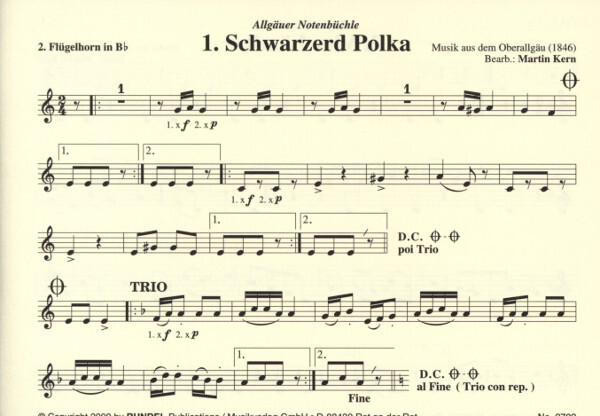 "Liebe Blasmusikfreunde ! Nach der Veröffentlichung der Allgäuer Bauernmusik und der Ober- und Westallgäuer Tanzbodenmusik freue ich mich ganz besonders über das Allgäuer Notenbüchle. Die 4-stimmigen Blechbläserstücke sind im Aufbau und im Stil ein Querschnitt meines musikalischen Schaffens der letzten Jahre. An erster Stelle stehen dabei die Bearbeitungen originaler Bläsermelodien aus Allgäuer Musikantenhandschriften des 19. Jahrhunderts. Diese sind vor allem durch die Trio-Form (oftmals mit einem 2. Teil im Trio) und die Melodie-Reihungen sehr interessant.Meine Eigenkompositionen orientieren sich im Aufbau an der gängigen Musizierpraxis der Volksmusik im Alpenraum. Besonders charakteristische Stilelemente sind dabei für mich der Wechsel zwischen DUR und MOLL und die Bordunmusik des Mittelalters mit der dafür typischen Dudelsackquinte.