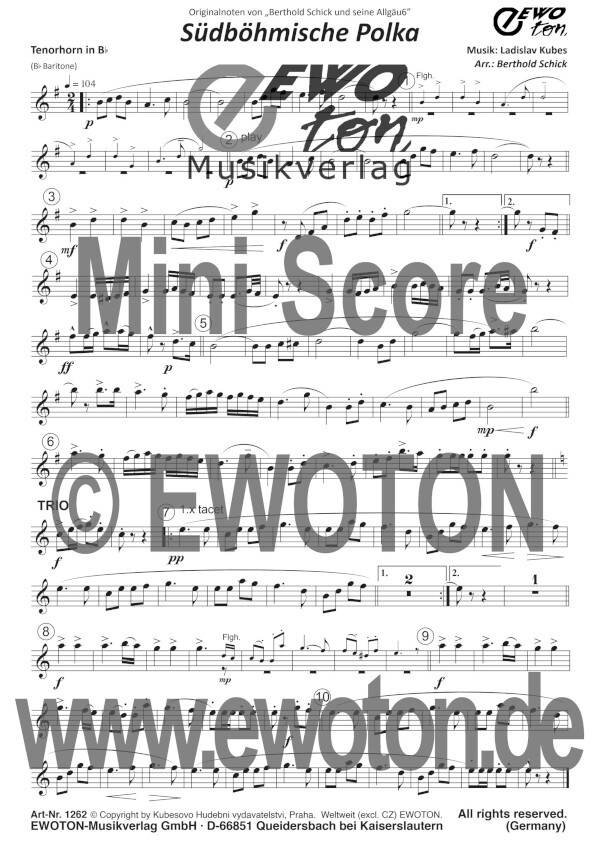 Die Besetzung besteht aus einem klassischen 6er Blech Register (1.+2. Flügelhorn Bb, Trompete Bb, Tenorhorn Bb, Bariton C/Bb und Bass C/Bb) und Schlagzeug und kann bei Bedarf um eine 1. und 2. Klarinette (ad lib.) erweitert werden - dafür steht unser PLUS! Somit sind Besetzungen mit bis zu 10 Musikern möglich. Zusätzlich enthält das Set auch eine 6-zeilige Partitur.