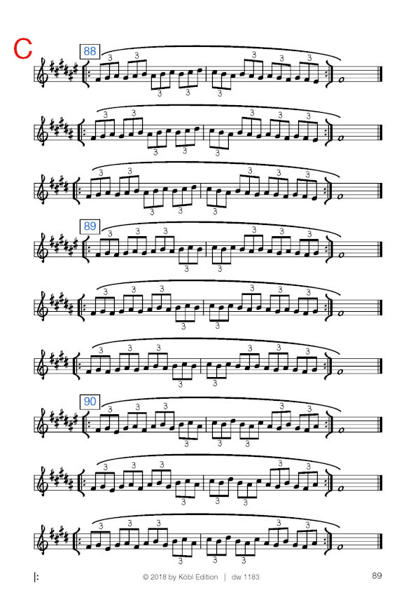 Wünschenswert wären also Übungen, die möglichst viele unterschiedliche Intervallfolgen möglichst oft wiederholen, dabei aber sowohl von der Länge, der Tessitur und vom Tonumfang her in einem Bereich bleiben, der häufiges und fehlerfreies Wiederholen problemlos ermöglicht. Ein Trick, um dies zu erreichen, sind sogenannte Permutationen. Dabei wird die Übung bei jedem Durchgang um einen Taktschlag versetzt begonnen und der fehlende Teil hinten wieder angehängt. Außerdem wird jede Skala immer nur abschnittsweise behandelt, also z.B. vom Grundton aufwärts bis zur 5. Stufe, oder abwärts zur 4. Stufe.