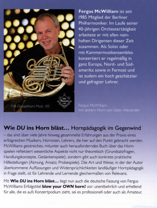 Mit Wie DU ins Horn bläst& liegt nun auch die deutsche Fassung von Fergus McWilliams Erfolgstitel blow your OWN horn! vor: unentbehrlich und erhellend für alle, die es aufs Konzertpodium zieht, sei es professionell oder auch als Amateur.