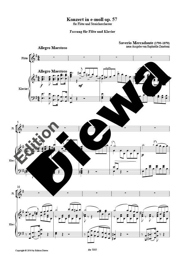 Cette nouvelle édition du concerto en mi mineur pour flûte et orchestre à cordes Opus 57 contient des indications darticulations dans la partie soliste et des cadences dans l'Allegro Maestoso - mesure 199 - et dans le Rondò Russo - mesure 155 dont une entrée mesure 96 -.