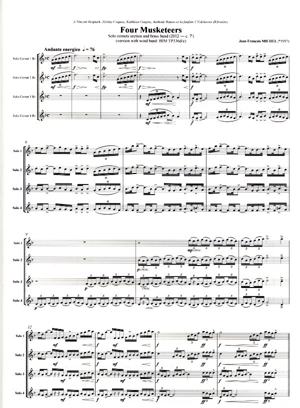 Jean-François Michel invites 4 cornet or trumpet players to play the heroic and audacious adventurers with their otherwise peaceful brass instruments. Musical pirouettes, jumping intervals or lyrical musical complicity challenge the soloists pugilistic imaginations in this exciting adventure with an appropriate accompaniment of a brass band (BIM TP336b/c) or optional wind band (BIM TP336d/e). Both versions include full sets of scores and parts.