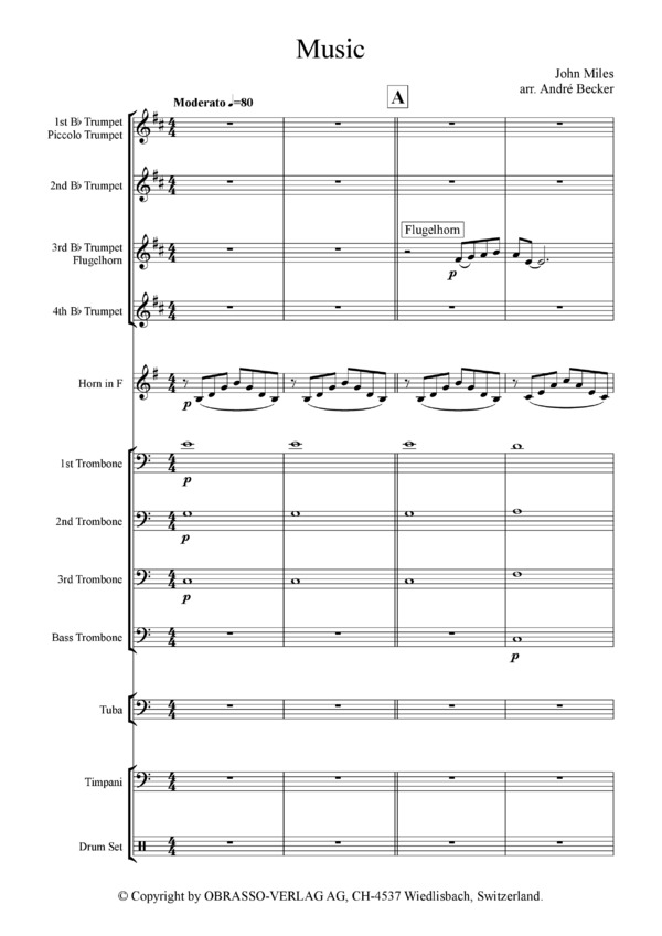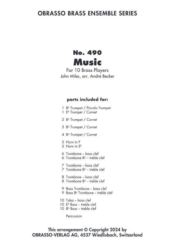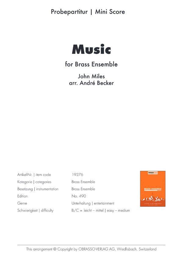 «Music» ist eine Komposition von John Miles (arr. André Becker). Im Webshop von Obrasso sind die Noten für Blechbläserensemble mit der Artikel-Nr. 19276 erhältlich. Das Notenmaterial ist eingestuft im Schwierigkeitsgrad B/C (leicht bis mittel).
