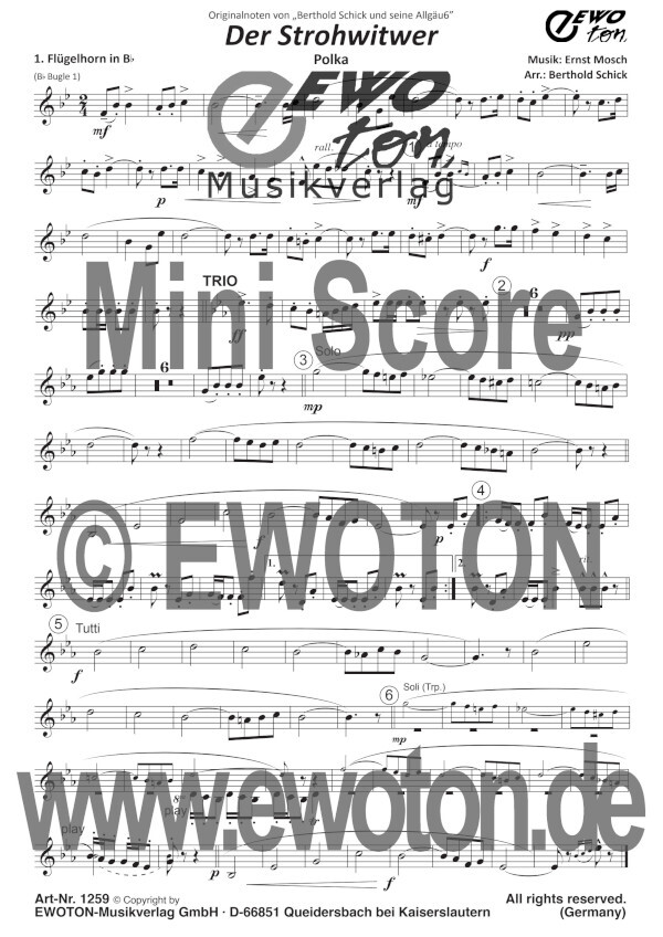 Die Besetzung besteht aus einem klassischen 6er Blech Register (1.+2. Flügelhorn Bb, Trompete Bb, Tenorhorn Bb, Bariton C/Bb und Bass C/Bb) und Schlagzeug und kann bei Bedarf um eine 1. und 2. Klarinette (ad lib.) erweitert werden - dafür steht unser PLUS! Somit sind Besetzungen mit bis zu 10 Musikern möglich. Zusätzlich enthält das Set auch eine 6-zeilige Partitur.