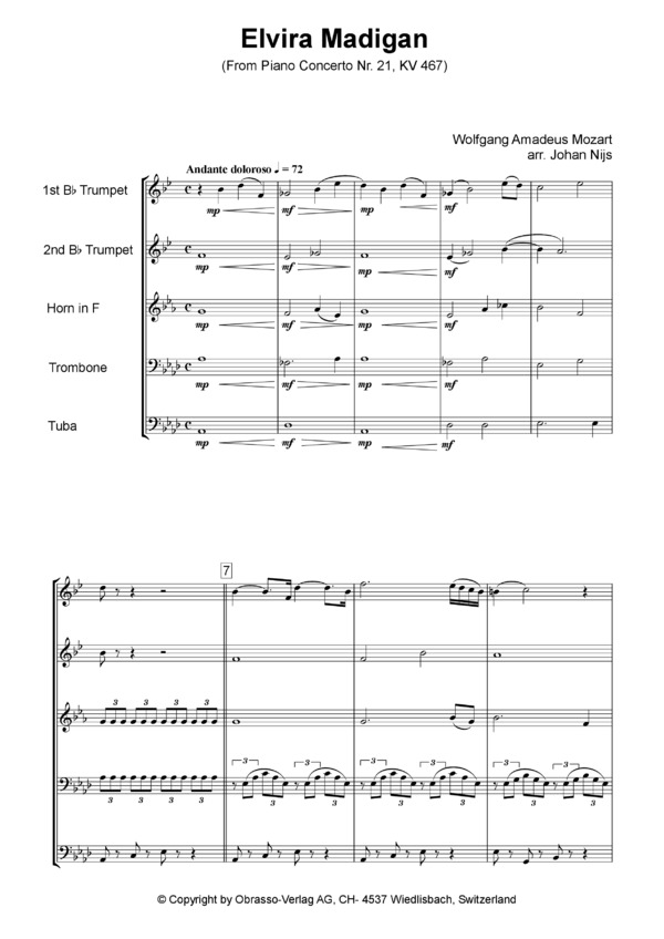 «Elvira Madigan» ist eine Komposition von Wolfgang Amadeus Mozart (arr. Johan Nijs). Im Webshop von Obrasso sind die Noten für Brass Quintett mit der Artikel-Nr. 19253 erhältlich. Das Notenmaterial ist eingestuft im Schwierigkeitsgrad B (leicht)