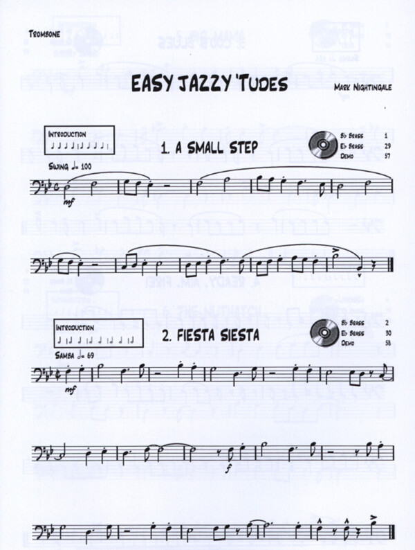 Easy Jazzy Tudes is now available with professionally recorded backing tracks that enhance your playing experience. Brilliant composer and performer Mark Nightingale has written 28 colourful etudes designed to help the younger player's first steps in jazz phrasing. The pieces all have descriptive titles such as Fiesta Siesta, Ready Aim Fire & Big Mama.
