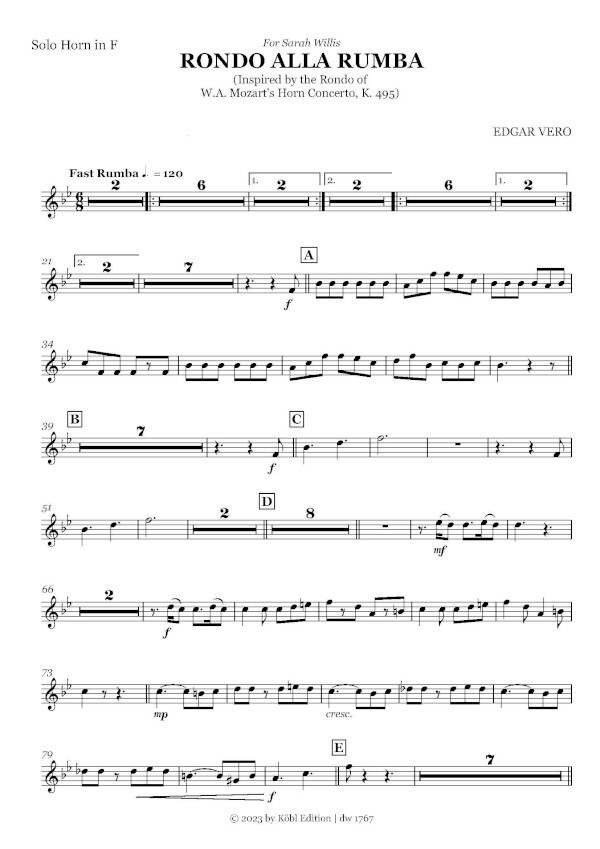 Jazz / SwingAusgabe: NotenArt-Nr.: OD2174 / DW1767ISMN: 9790207920317 Level: Soundbeispiel There is a statue of Wolfgang Amadeus Mozart in Havana. On my first visit toCuba in 2017, I was told by one of the local musicians: Mozart would havebeen been a good Cuban. I was intrigued by this comment and thus began theinspiration for this album which was recorded in Havana, Cuba in January,2020 and released by Alpha Classics on July 10th, 2020.At the time of my first visit to Cuba, I had already been dancing salsa formany years so I knew and loved Cuban popular music. Salsa, son, mambo, bolero these are my idea of musical heaven. But the Cuban classical scene wascompletely unknown to me. I had been asked to give a French horn masterclasson my first trip there but had no idea what to expect how many horn playerscould there be in Cuba? I was blown away by how many turned up to class, howwell they played and how full of music they all were. I felt an immediateconnection with my new Cuban musician friends and through them, I started todiscover the classical music culture of Cuba. Mozarts statue in Old Havanabegan to make complete sense. I decided then and there to do what I could toraise awareness for the wonderful classical music-making going on in Cuba.Thus the Mozart y Mambo project was born. This exciting, unique and, Iadmit, somewhat crazy project combines much-loved solo pieces for French hornby Wolfgang Amadeus Mozart with traditional Cuban music. These are perhapsnot the most obvious pairing but to all those who ask me, why record Mozartin Cuba, I can only say once you hear it, you will know why. The energy andpassion of these musicians is so inspiring and I hope you will be able tohear the special atmosphere we created during the recording. This project hasbeen one of the highlights of my life and we are so happy that 3b Produktionwere with us and made a wonderful documentary about the project called ACuban Journey with Sarah Willis, which was broadcast on Deutsche Welle TV.I am happy and proud to have worked on this album with the Havana LyceumOrchestra, a chamber orchestra made up of young and talented Cuban musiciansand their Cuban conductor José Antonio Méndez Padrón (Pepe), and alsowell-known musicians from the Cuban popular music scene. I could not havewished for a more inspiring and hard working team of musicians with whom torealise this project. Part of the proceeds from the album will go towardsbuying instruments for the musicians of the Havana LyceumOrchestra.!Disfrutar!