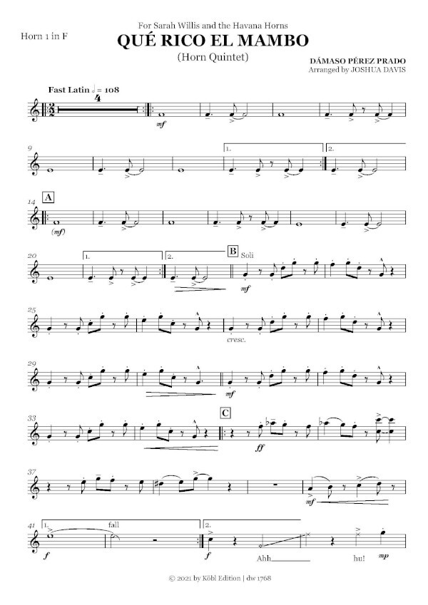 Soundbeispiel There is a statue of Wolfgang Amadeus Mozart in Havana. On my first visit toCuba in 2017, I was told by one of the local musicians: Mozart would havebeen been a good Cuban. I was intrigued by this comment and thus began theinspiration for this album which was recorded in Havana, Cuba in January,2020 and released by Alpha Classics on July 10th, 2020.At the time of my first visit to Cuba, I had already been dancing salsa formany years so I knew and loved Cuban popular music. Salsa, son, mambo, bolero these are my idea of musical heaven. But the Cuban classical scene wascompletely unknown to me. I had been asked to give a French horn masterclasson my first trip there but had no idea what to expect how many horn playerscould there be in Cuba? I was blown away by how many turned up to class, howwell they played and how full of music they all were. I felt an immediateconnection with my new Cuban musician friends and through them, I started todiscover the classical music culture of Cuba. Mozarts statue in Old Havanabegan to make complete sense. I decided then and there to do what I could toraise awareness for the wonderful classical music-making going on in Cuba.Thus the Mozart y Mambo project was born. This exciting, unique and, Iadmit, somewhat crazy project combines much-loved solo pieces for French hornby Wolfgang Amadeus Mozart with traditional Cuban music. These are perhapsnot the most obvious pairing but to all those who ask me, why record Mozartin Cuba, I can only say once you hear it, you will know why. The energy andpassion of these musicians is so inspiring and I hope you will be able tohear the special atmosphere we created during the recording. This project hasbeen one of the highlights of my life and we are so happy that 3b Produktionwere with us and made a wonderful documentary about the project called ACuban Journey with Sarah Willis, which was broadcast on Deutsche Welle TV.I am happy and proud to have worked on this album with the Havana LyceumOrchestra, a chamber orchestra made up of young and talented Cuban musiciansand their Cuban conductor José Antonio Méndez Padrón (Pepe), and alsowell-known musicians from the Cuban popular music scene. I could not havewished for a more inspiring and hard working team of musicians with whom torealise this project. Part of the proceeds from the album will go towardsbuying instruments for the musicians of the Havana LyceumOrchestra.!Disfrutar!Havana, Cuba 2020