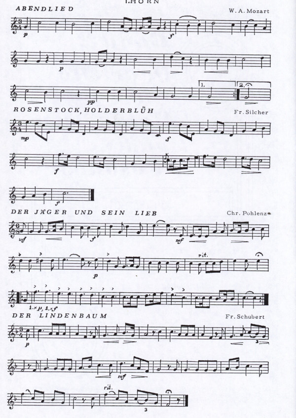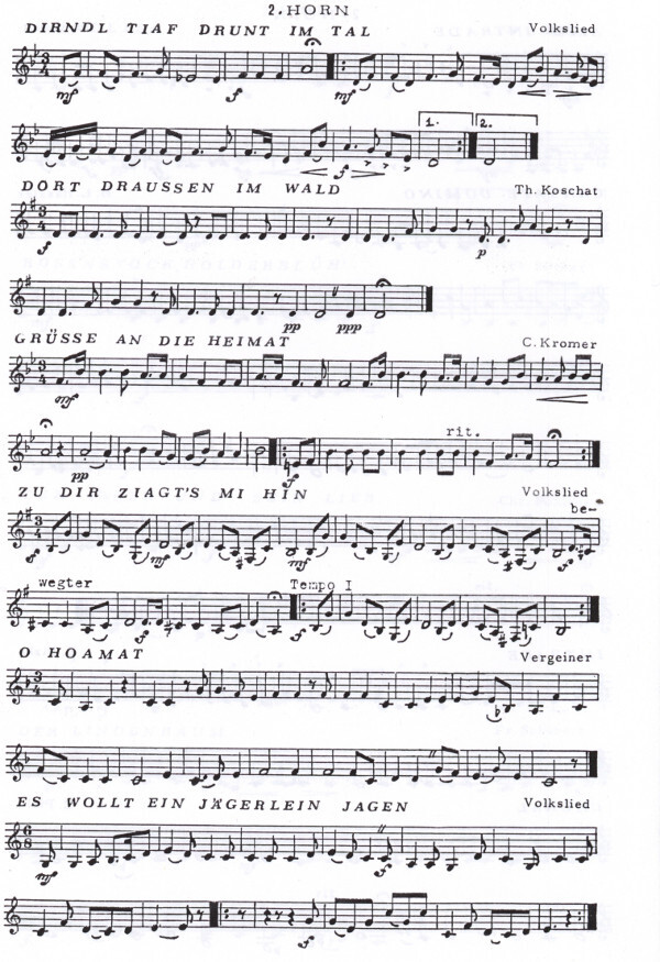 W.A. Mozart: Abendlied / Silcher: Rosenstock, Holderblüh / Pohlenz: Der Jäger und sein Lieb / Schubert: Der Lindenbaum / Alte Intrade / Hassler: Cantate Domino / E. Pizka: Intrade / E. Pizka: Choral / Volkslied: Dirndl tiaf drunt im Tal / Koschat: Dort draussen im Wald / Kromer: Grüsse an die Heimat / Volkslied: Zu dir ziagt's mi hin / Vergeiner: O Hoamat / Volkslied: Es wollt ein Jägerlein jagen / Palestrina: O vos omnes / Bruckner: Angelus läuten / Schantl: Breuner Fanfare / C.M.v. Weber: Lützows Jagd / Silcher: Im Mai / Stunz: Ins Freie / Böck: Polka / Hermes: Das einsame Röslein / Silcher: Heut gang I' ans Brünnele / Silcher: Das Leben bringt gross Freud / E. Pizka: Tempo di Menuetto / E. Pizka: Tänzchen / E. Pizka: Tempo di Marcia / E. Pizka: Jagdanblasen / E. Pizka: Jungbläserfanfare