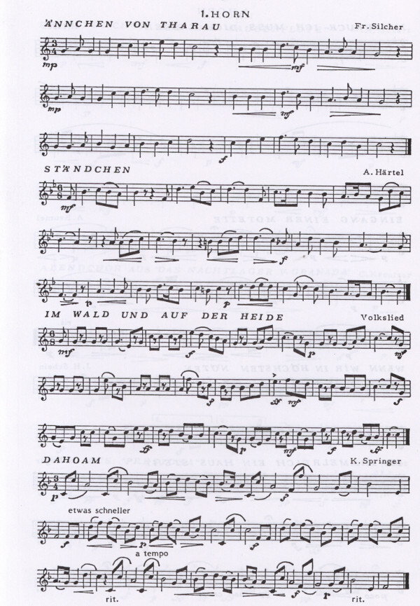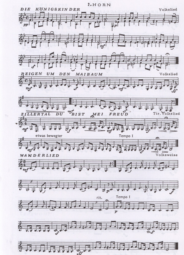 für 4 Hörner im Violinschlüssel (bei den Bänden 2 + 3 kann das 4. Horn durch eine Posaune ersetzt werden, es liegen hierfür jeweils eine Posaunenstimme im Baßschlüssel bei)