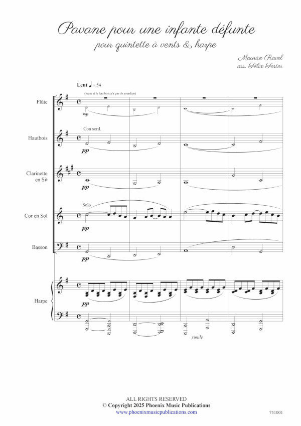 Pavane pour une infante défunteby Maurice Ravelfor wind quintet and harparranged by Félix FosterMaurice Ravels Pavane pour une infante défunte (Pavane for a Dead Princess) is one of his most beloved early works, originally composed for solo piano in 1899 and later orchestrated by the composer in 1910. Evocative of a slow, stately Renaissance dance, the piece is not meant to mourn a specific person, but rather to capture the delicate grace and nostalgic elegance of a bygone era. Ravel himself described it as an evocation of a pavane that a little princess might have danced at the Spanish court.This new arrangement by Félix Foster reimagines Ravels atmospheric gem for wind quintet and harp, offering a fresh and colorful texture that retains the originals refined melancholy and gentle charm. The harp serves as a lyrical and shimmering foundation, while the woodwinds bring warmth, intimacy, and expressive nuance to the melodic lines. This version is ideal for chamber music concerts, offering performers and audiences alike a new perspective on a timeless miniature.Félix Fosters thoughtful adaptation pays close attention to Ravels distinctive harmonic language and orchestral sensibility, creating an arrangement that is both faithful to the spirit of the original and idiomatic for the ensemble.This edition is part of our new "Historical Treasures" seriesa curated collection dedicated to rediscovering and revitalizing significant works from the past. The series features compositions ranging from the obscure to the well-known, many of which are difficult to obtain in quality editions. Our mission is to make these gems more accessible by offering carefully prepared scores, free of misprints and editorial errors that often plague older publications. Where possible, we also provide editorial improvements to enhance readability and performance practicality, ensuring these works can be enjoyed by musicians and audiences alike.