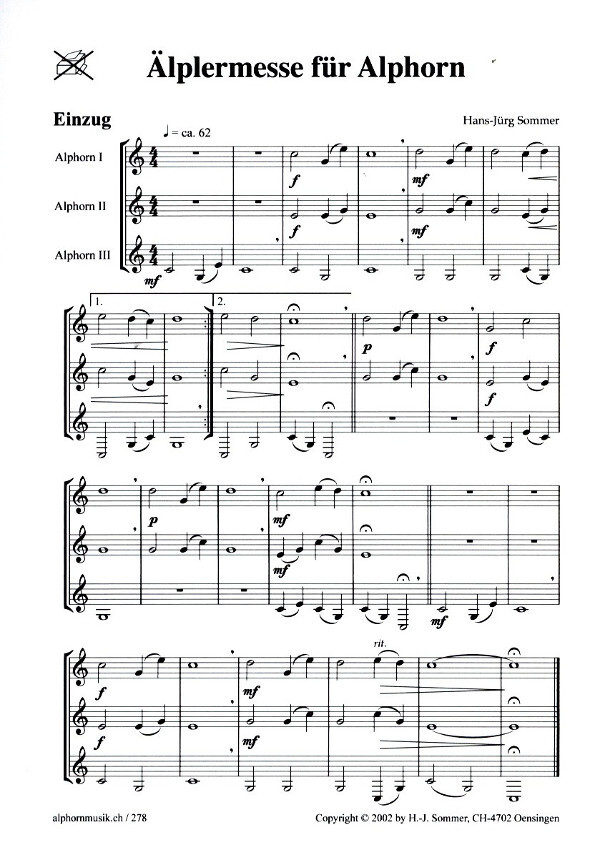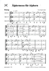Diese Messe für Alphorn-Solo, -Duo, Trio oder auch für eine ganze Gruppe, hat H.-J. Sommer für seine Aphornfreunde im Allgäu geschrieben. Sie ist blastechnisch sehr leicht gesetzt - die erste Stimme muss im Gloria nur viermal kurz ins g" spielen. Sonst liegt der höchste Ton bei e".