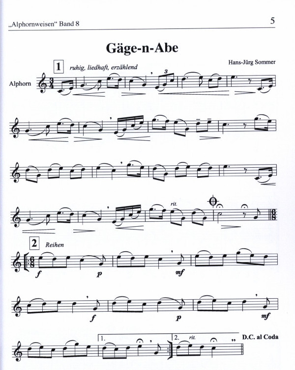 Sammelband mit Alphornweisen in unterschiedlichen blastechnischen Schwierigkeitsgraden und unterschiedlicher Besetzung (Solo, Duo, Trio, Quartett oder Gruppe).
