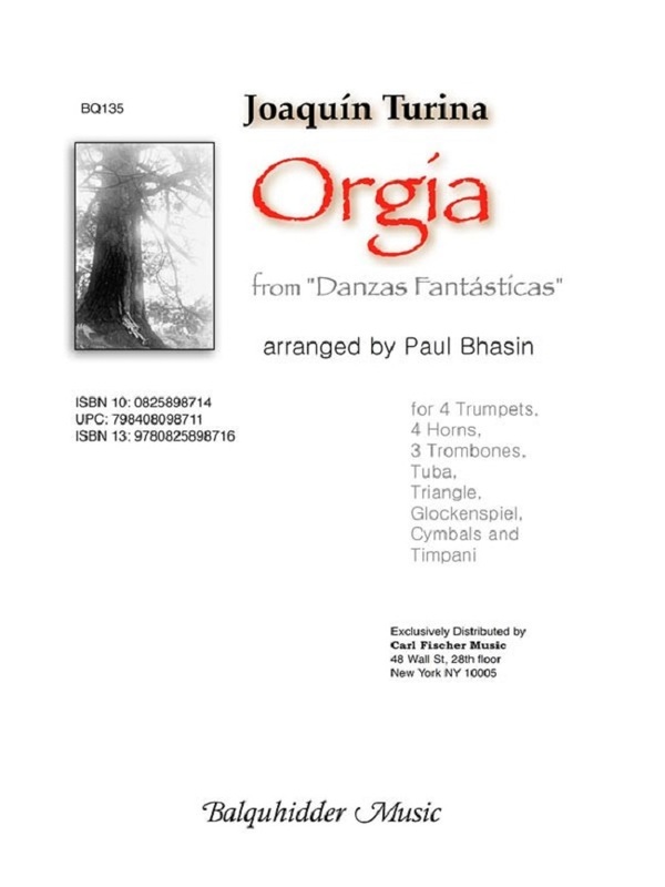 Turina's popular Danzas fantasticas was written for solo piano in 1919, soon thereafter orchestrated by the composer. The set of three dances was inspired by the novel La orgia by Jose Mas, and a quotation from the text preceded each dance in the score. For the third movement, Orgia, the inscription read, "The perfume of the flowers merged with the odor of manzanilla, and from the bottom of raised glasses, full of the incomparable wine, like an incense, rose joy." Paul Bhasin has crafted a virtuoso arrangement for brass and percussion, to add spice to any program.