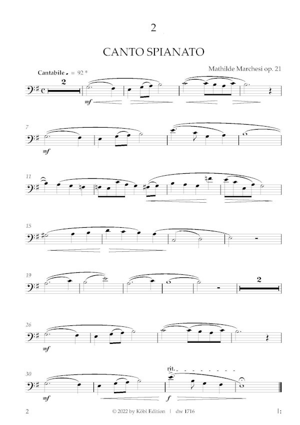 Der Erwerb dieses wertvollen Fachwissens führt zu verschiedenen Reflexionen auch über das Studium unseres Instruments: wenn einerseits weitere und noch spezifischere Übungen zur Entwicklung der Spieltechnik identifiziert werden können (diese Thematik wurde in methodologischen Ansätzen wie z.B. Arban 1852 und darau ffolgende Versionen behandelt2), ergibt sich andererseits die Notwendigkeit, dem Klang spezifische Aufmerksamkeit zu schenken ein Aspekt, den ich bei der Posaune als nicht weniger wichtig als beim Gesang betrachte (vgl. die Aufforderung von Arnold Jacobs Erfülle deinen Geist mit Klang). Konzipiert wurde die vorliegende Sammlung eigens zur Unterstützung bei der Suche eines reinen Klangs in einem musikalischen Kontext, mit besonderer Aufmerksamkeit auf die Intonation, das Legato und die Phrasierung.Unter Berücksichtigung dieser primären Zielsetzung bietet die Sammlung eine Vielfalt an didaktischen Beiträgen von AutorInnen, die unter den MusikerInnen bzw. SängerInnen des neunzehnten Jahrhunderts den höchsten Stellenwert hatten: Gioachino Rossini (1792-1868), Davide Banderali (1789-1849), der unter den ersten in der Musikgeschichte als Tenore Buffo auftrat; Auguste Mathieu Panseron (1796-1859), Autor von wesentlichen didaktischen Werken; Heinrich Panofka (1807-1887), dessen innovativer Ansatz in Europa und Amerika eine außerordentliche Resonanz fand, und Mathilde Marchesi (1821-1913), die zu den von den größten MusikerInnen ihrer Zeit sowie vom Publikum verschiedener europäischer Länder am meisten geschätzten Sängerinnen und Gesanglehrerinnen Eine besondere Rolle spielt unter den hier vorgeschlagenen Übungen das Stück von Eugène-Emile Diaz de la Peña (1837-1901), Autor von musikalischen Gedichten: hier zum ersten Mal als Übung vorgeschlagen, kann diese kurze Komposition als Beispiel für die didaktische Anwendung von Material dienen, das ausschließlich für künstlerische Zwecke konzipiert wurde. Das Kriterium für die Auswahl der AutorInnen der Vokalisen entspricht dem Wunsch, die Verfeinerung der technisch-interpretativen Fähigkeiten mit dem ästhetischen Genuss bei der Ausführung, von dem meines Erachtens kein/e MusikerIn absehen kann, zu verbinden. Die vorgelegten Vokalisen waren ursprünglich für den Gesang bestimmt: bei der Definition der didaktischen Ziele wurden die Unterschiede zwischen Stimme und Instrument im Folgenden selbstverständlich berücksichtigt. Der hier angewandte systematische Ansatz wurde in 23 Übungen zusammengefasst, die als kompakter und wesentlicher Referenzpunkt für PosaunistInnen dienen sollen. In der Beilage befinden sich außerdem Noten für die Klavierbegleitung