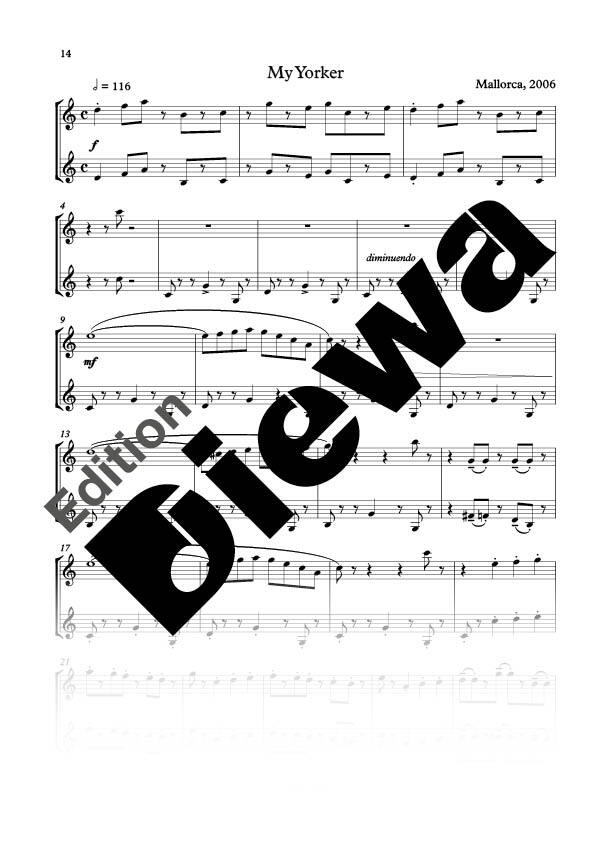 The letter "x" is, in those parts, pronounced "sch", and the piece lasts exactly as long as one requires to find out what Schlendrian's means & Agia Galini is an enchanting little village in the south of Crete where I filled the occasional pauses for breath between writing postcards by penning this duet. In case of doubt: this work exists purely for our mutual pleasure and makes no demands of consideration on the musicological community whatsoever. While lazing around on the Mediterranean island My Yorker I composed this little ditty in order to escape the inexorable grasp of Otto Nicolai's horn duets, which we have, in the cause of steeling our embouchures, spent the last 27 years (as of 2017) honking for everybody and nobody all around the globe.