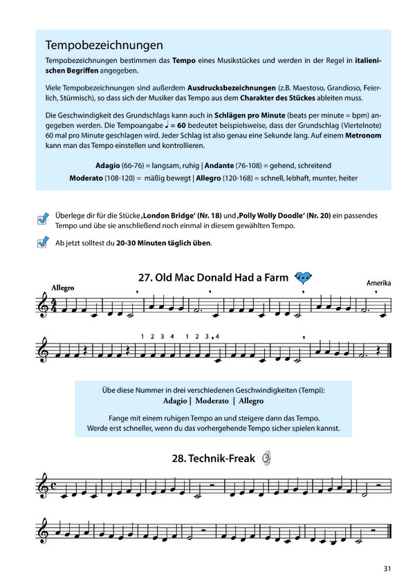 " Zahlreiche Solostücke, Duette, Übungen und Etüden aus verschiedensten Stilrichtungen sorgen für Abwechslung und Motivation und fördern gleichzeitig die technischen und musikalischen Fähigkeiten. " Rhythmusübungen zur Schulung des Rhythmusgefühls.