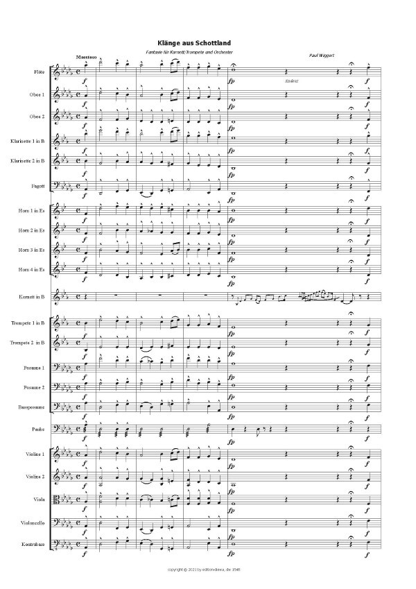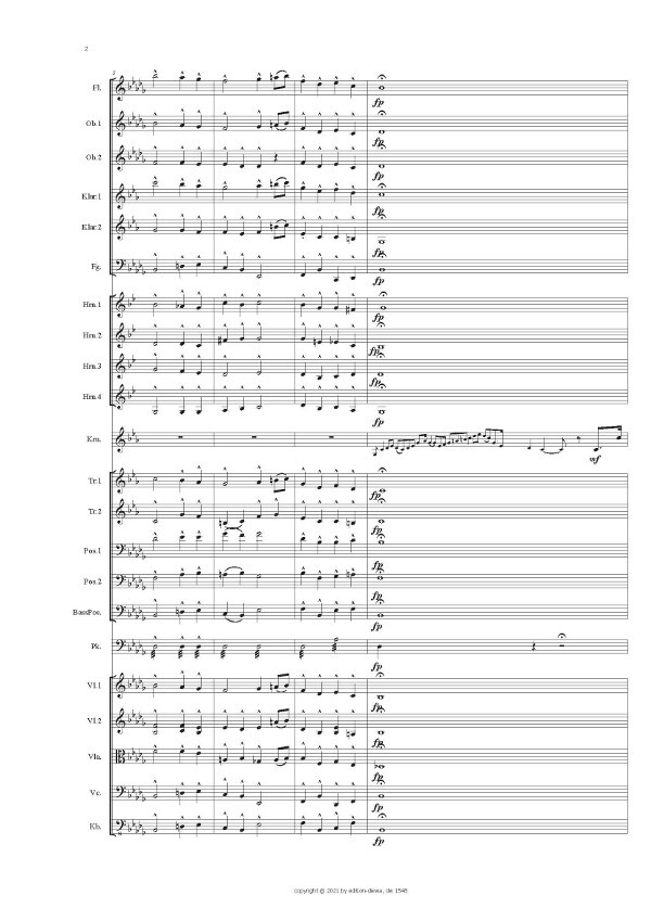 Harmonjie: Flöte, 2 Oboen, 2 Klarinetten in B, Fagott, 4 Hörner in Es, 2 Trompeten in B, 3 Posaunen, Pauken