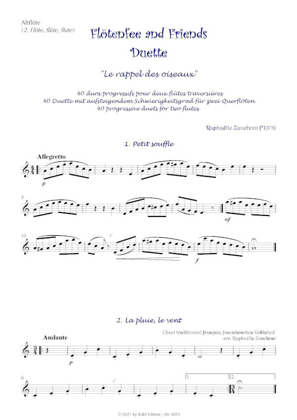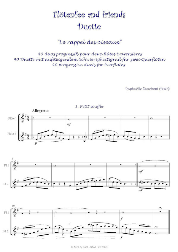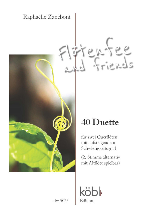 Die Sammlung Flötenfee and Friends, 40 Duette mit aufsteigendem Schwierigkeitsgrad für zwei Querflöten wurde im Frühling 2021 erstellt. Die Kompositionen und Bearbeitungen sind nach Schwierigkeitsgrad von leicht bis schwierig geordnet. Die Stücke sind für den Unterricht geeignet, können aber ebenso im Rahmen eines Vorspiels oder Wettbewerbs gespielt werden. Die zweite Stimme kann alternativ von einer Altflöte gespielt werden (mit Ausnahme der Nr. 29, 34, 39 und 40). Die Stimme hierfür liegt dieser Ausgabe bei.