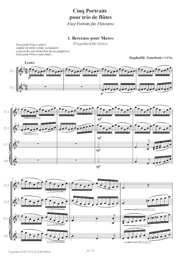 Fünf Portraits für Flötentrio, Berceuse pour Marco - Camarel - Le roi de la Mont agne Blanche (Der König der weißen Berge) - Le voyageur (Der Wanderer), Partitur und Stimmen, 2012)